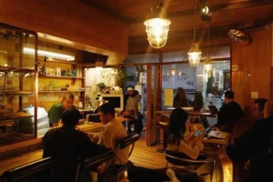 伝統的な日本様式を取り入れたスティルカフェの空間は、テーブルや椅子から壁や屋根に至るまで、主に木材を使用し、素朴で居心地の良い雰囲気を醸し出しています。鯉のぼり、招き猫、木の札、青竹など、店内には日本らしい装飾が随所に散りばめられ、親密な雰囲気を醸し出しています。お客様は、お好みに合わせてクッション席または丸い木製の椅子席をお選びいただけます。